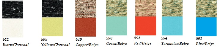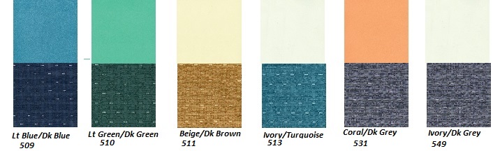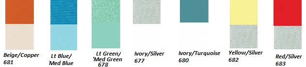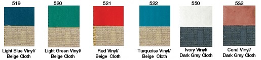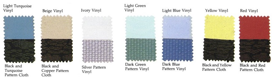Beige#2114 Med Green#2113 Med Blue #2112 Turquoise#2115 Coral#8618 Grey#2116 Black Pref. Vinyl#8618 White Pref.#3893W Black Vinyl#3893V Black Cloth#3893 |